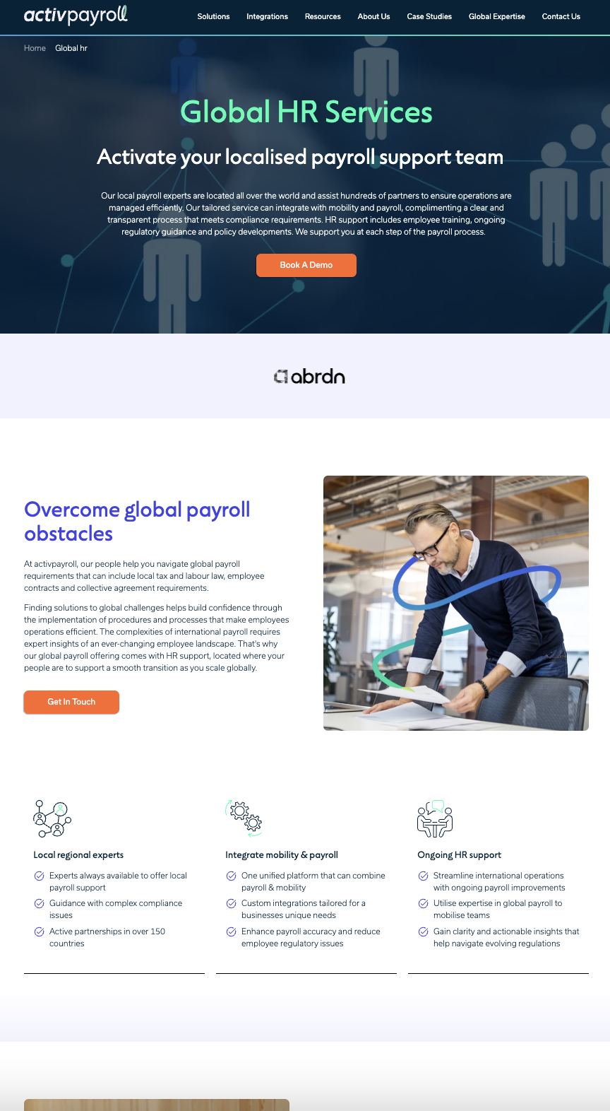Crafted confident, benefit-led copy across key service areas, positioning activpayroll as a globally trusted partner